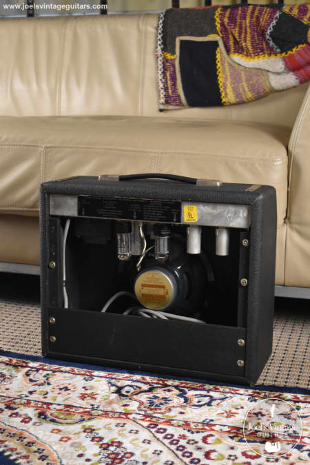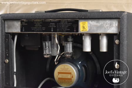 Upgrades & modifications to this amp include a newer Jensen special design 8 inch speaker, newer Sovtek tubes replacing the 5Y3, 6V6, and two 12AX7, multi-capacitor can replaced with 3 caps. The vibrato foot switch has been replaced with a period-correct two button foot switch. Chassis back cover is also removed.